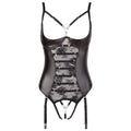 Beautiful design with ingenious insights! Sensual string body with adjustable and detachable suspender straps and a lightly padded shelf bra with a hook fastener at the back. With delicate strap details and elaborate rhinestones in the cleavage area. The semi-transparent lace inserts at the front allow lascivious insights. Above that, there are additional refined lacings with silver rings and stretchy straps. The crotch is completely open and features exciting strap details and rhinestones as well. 90% polyester, 10% spandex, lace 90% polyamide, 10% spandex.