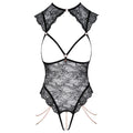 Sensual sophistication! Black open body by Abierta Fina made of soft stretch floral lace. Elastic velvet ribbons and rose gold-coloured accessories underline the elegant, showy look. Seductively busty and with shoulder-covering lace. A glittering rhinestone ring at the front of the neck, a small hook fastener at the back. A beautiful heart pendant between the open stretch band cups. 2 removable thigh chains on each of the high leg cuts. The stimulating chain in the open crotch is also removable. The straps and 3 velvet stretch straps on the open back are adjustable to fit. 90% polyamide, 10% elastane. Open body made of floral lace With elastic velvet bands Beautiful rose gold-coloured decorative elements Seductively braless String invitingly open in the crotch Stimulating step chain removable Removable thigh chains Adjustable straps and back strap Soft and elastic for high wearing comfort