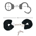 Metal handcuffs covered with soft black plush polyester. Safety cuffs, opens with a key or with a click. Textile covers removable