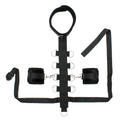 Black padded collar with a buckle fastening and silver o-ring. From the collar comes a restraint line with 4 different restraint positions. The restraint line is held in place by a waist strap. Padded wrist cuffs are also included.
