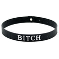 Black silicone adjustable collar. The word BITCH is written on the front of the collar in white letters.