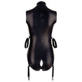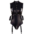A strict dominant look, soft comfortable material! A stretchy body in a matte black look with metal details and suspender straps. With zips over the breasts and decorative studs at the front. There are also arm loops with hook and loop fasteners at either side of the body and a zip at the back. There is a 2-way zip over the crotch. The suspender straps are adjustable and removable. 90% polyester, 10% spandex.