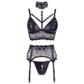 3-piece lace set with matte look material and studs. Bralette with cups that can be unbuttoned. Strap details in the cleavage area and collar. Suspender belt incl. straps with a decorative ring. Adjustable suspender straps. Handcuffs with hook and loop fasteners at the back. Briefs with press studs over the crotch and bum. For seductive women who know what they want! Beautiful bralette with removable cups can be unbuttoned, adjustable straps in the cleavage area and a choker. The matching suspender belt has an eye-catching design with a strap that has a decorative ring at the front. It also offers adjustable suspender straps and removable handcuffs with hook and loop fasteners at the back. Briefs with press studs that go over the crotch and stop at the top of the buttocks. Made out of floral lace in combination with trendy matte look and studs. 90% polyester, 10% spandex lace 90% polyamide, 10% spandex.