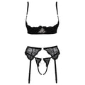 Shelf bra, suspender belt and crotchless thong combined in a set from Cottelli LINGERIE. All are made from soft black stretch lace and decorated with silver-coloured rings and elegant velvet details. Decorated with chains and beads between the cups and the front of the crotchless thong, all of which are removable. The lightly lined underwired cups show off the breasts in an exciting way. The straps and hook fastening at the back can be adjusted to fit. Waist suspender belt with adjustable suspender straps and hook fastener at the back. The small lace thong seduces with its completely open crotch and small bow over the bum. Shelf bra, suspender belt and crotchless thong in a set Delicate lace with velvet details Removable decorative chains Silver-coloured rings Shelf bra with lightly padded underwire cups Inviting crotchless thong Adjustable straps and suspenders Soft and stretchy for high comfort Elegant, erotic trio with lots of jewel details! 90% polyamide, 10% spandex. Supplied without stockings.