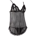 Babydoll with adjustable straps and hook closure at the back. The open cups, which can be closed with a small bow, are ruffled, the hem is made of lace. Including string.