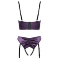 Quarter cup bra and crotchless suspender thong in a set from Cottelli LINGERIE. Made from dark purple stretch satin in a classy gathered look with black details. The longer-cut, underwired bra with lightly padded cups puts the bust in the spotlight and creates an irresistible eye-catcher. The straps and the hook fastening in the back are adjustable to fit. The suspender thong seduces with a completely open crotch. The suspenders are adjustable and can also be removed completely. Quarter cup bra and crotchless suspender thong in a set Purple stretch satin with black details Elegant gathered look Crotchless design Removable suspenders Adjustable straps and suspenders Soft and stretchy for high comfort Opulent, gathered look in an elegant colour! 90% polyamide, 10% spandex. Stockings not included.