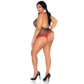 School girl ruffle-trimmed fishnet deep-V crotchless teddy with a school tie and cheeky bareback. One Size