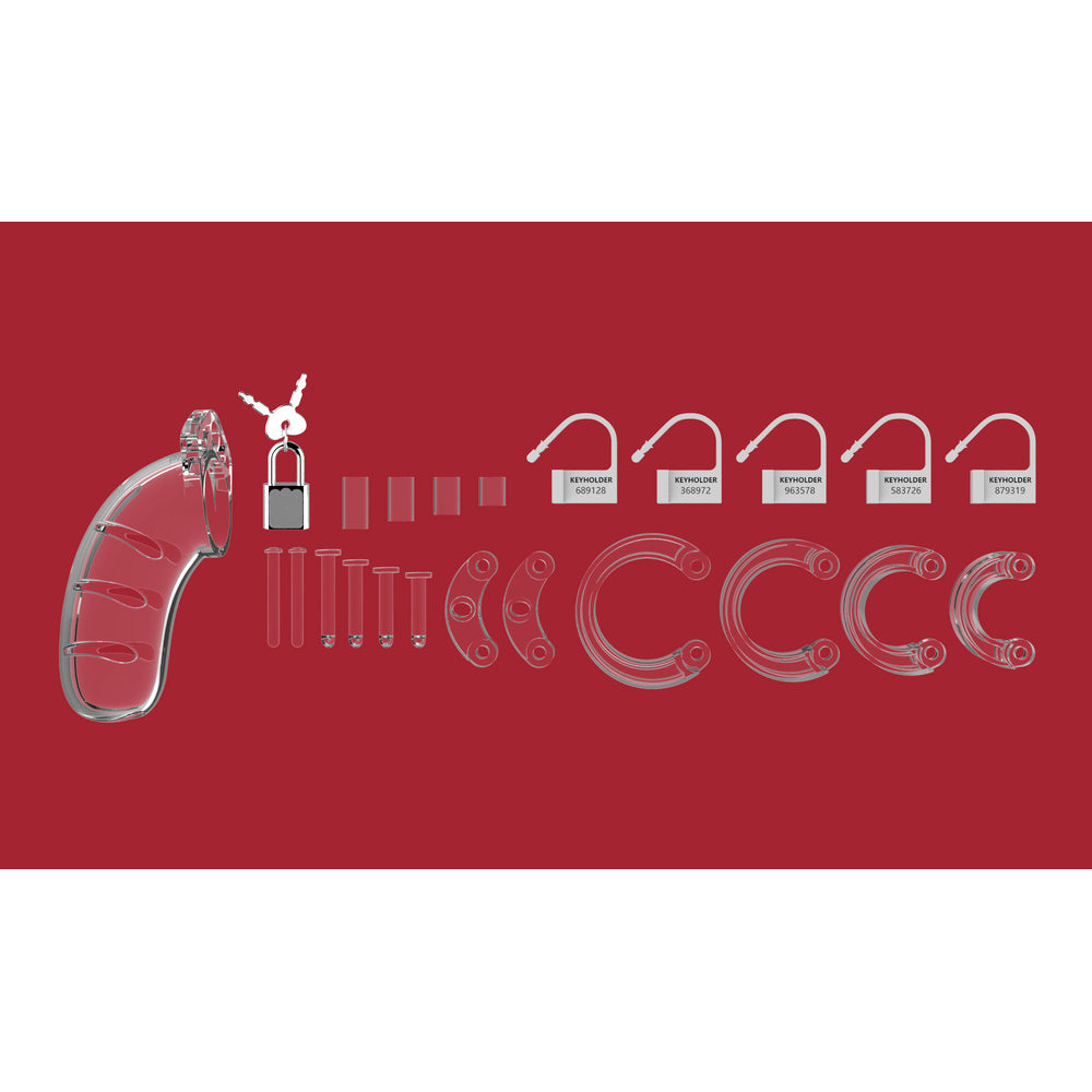 Man Cage Chastity Cages are manufactured from high-grade polycarbonate, a very light, durable and hypoallergenic material. The cage consists of three parts that fit perfectly together. The two guidance pins connect the top parts and the oval taper pin connects the rings with the cage. A variety of rings in different sizes and distance pieces will allow you to create the perfect size! The rings have a comfortable fit and are absolutely safe. A metal lock or tie-wrap lock can easily close the cage. The included tie-wrap locks ensure that they will not trigger the alarm of metal detectors at parties, festivals or even airports! As hygiene is very important while wearing a cage, the superior Man Cage series are equipped with a variety of vents and a urination opening. The cage makes it impossible to get an erection but once released the world is your oyster! The Man Cage Chastity Cage gives the key-holder optimal power over sexual gratification! Adjustable rings inside diameter 4,5 cm, 5 cm, 5,5 cm, 6 cm