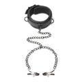Enjoy turning your submissive lover into a Collared Temptress with this neoprene collar with black chains connected to adjustable nipple clamps! The collar itself has black buckles for a fully adjustable fit and 3 D-rings to attach accessories or chains and restraints to. The center D-ring has black chains already connected that split into two chains, each with a nipple clamp at the end. Each nipple clamp has a rubber tip to protect the sensitive skin tissue and a small screw for precise pressure adjustments. All metal is nickel-free. Have your lover kneel in front of you as you place their collar around their neck. The buckles clasp and you make sure the collar fits snug and comfortably so they can feel the gentle, padded and smooth texture of the neoprene. You take the chain at the center of their throat and pull them gently towards you, making them lift their chest. Taking their nipple in your free hand, you take the clamp and place it slowly behind the nipple, on the areola, and adjust the pressure using the small screw. Doing the same on the other nipple, you hear your lovers breath catch in their throat and gasp as they begin to mingle pain and pleasure, experiencing it all at your hands. To clean, simply spray with a toy clean and wipe dry. Measurements. The collar adjusts from 12.5 to 15.75 Inches. Chain 22 Inches. Nipple Clamps open to 0.5 inch wide.