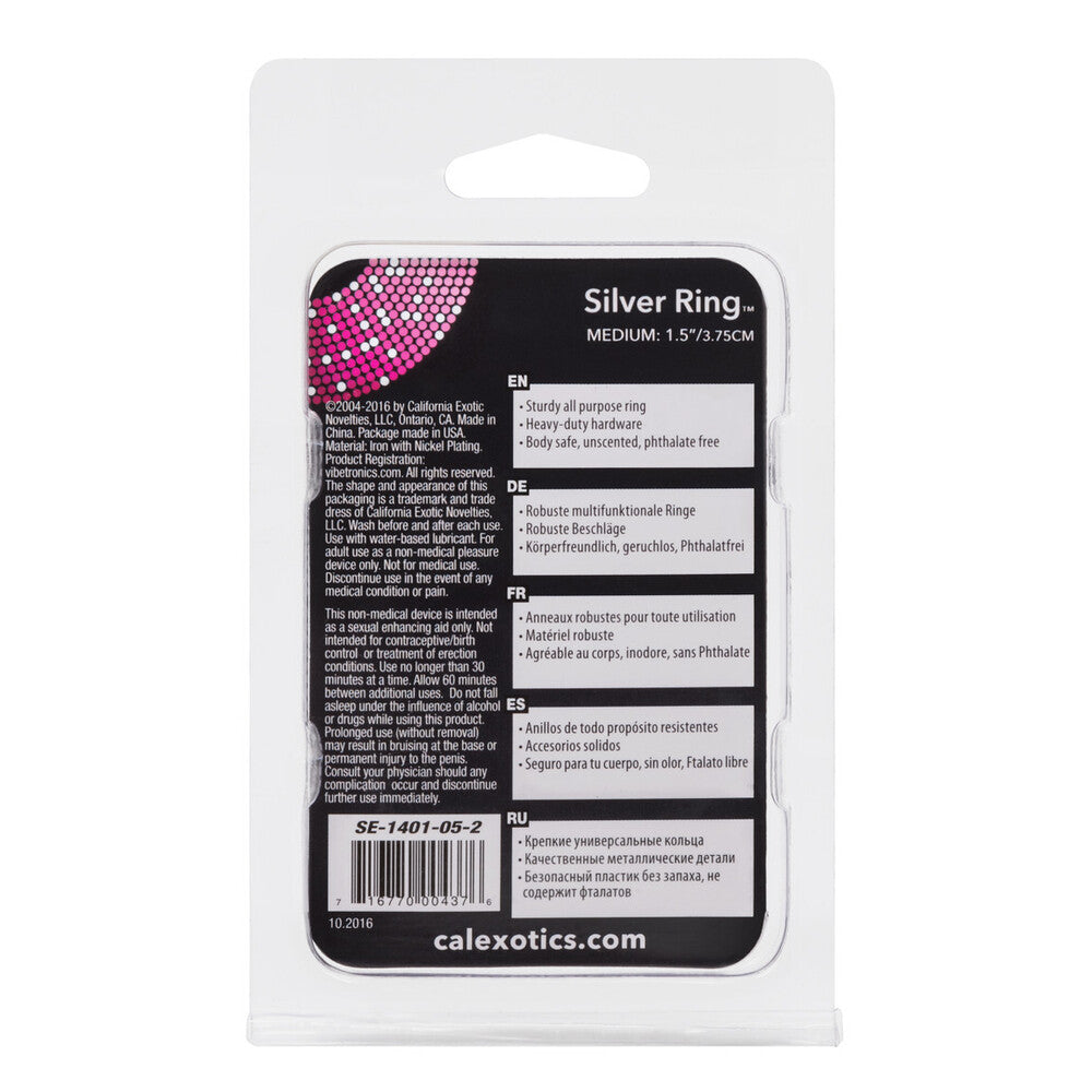 Elevate your passionate, intimate performance with the Silver Ring. The sleek, medium-sized metal adornment ring is designed for erotic arousal and stimulation pleasure and provides a comfortable, supportive fit for extended orgasmic satisfaction. The easy to use enhancer ring maintains erection stamina and increases sensitivity and stimulation ecstasy. Ideal for first time and experienced users, the metallic ring is easy to fit and ensures comfortable non-slip support for peak sensual enjoyment. The smooth, metal ring-shaped enhancer comfortably slips over the erect penis to maintain erection duration and to stimulate heightened orgasmic climax. Use your imagination, and slip on the arouser ring to explore your secret wild fantasies. Enjoy unlimited tantalizing tingles of pleasure during self-gratification, or intimate couples play, with the exotic, understated solid steel ring. To increase sensitivity, and to extend amorous exploration, it is recommended that you use a quality lube with this toy.