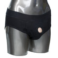 Black brief harness, add your own dong or stimulator Discreet 2 panel design to accommodate dual penetration Reinforced O ring stretches to accommodate most packers, dongs or probes Soft, stretchy and comfortable Comfortable soft lining Internal strap to secure your packer in place, packer not included Internal pockets to add a favorite stimulator, not included Washable 95 percent Cotton, 5 percent Spandex For women