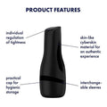 With an elegant cover made of robust, black ABS plastic, this mens sexual wellness device is a real pleaser and is also discreet. Inside the Men Classic is a sleeve made of skin-like Cyberskin material, which provides a realistic feel with a distinctive texture. The masturbator for men can be closed hygienically and stored discreetly thanks to the closing cap. And thanks to the innovative internal pressure regulator you can add extra intensity when using the Satisfyer Men Classic. You can purchase and easily exchange additional sleeves with varied textures so you can always find the right sleeve for your mood! For a smooth experience, we recommend using a lubricant. The inner sleeve can be removed easily for cleaning. With the right care, you can enjoy your Men Classic for a long time. To clean the surface of the sleeve, wash with warm water and mild soap. You can ensure thorough hygiene with a few sprays of a disinfecting sexual wellness device cleaner.