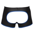 Trendy matte look pants with an open back. Showmaster holes for the penis and testicles. The pants feel very exciting. Stretchy and very comfortable. A provocative style at the front and back! Pants with an open back from Svenjoyment. They also have showmaster holes for the penis and testicles. Made out of trendy, black matte look material with contrasting, stitched cut-outs in a royal blue colour. There is also royal blue material around the legs. The tight-fitting but stretchy material is extremely comfortable. The provocative holes are not just an eye-catcher, but they also feel very exciting. 94% polyester, 6% spandex, polyurethane coating.