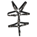 The ultimate harness for leather lovers! Strap body made from black studded leather belts and steel connection rings. Individual fit thanks to multiple adjustable buckle fasteners. The testicle ring keeps him or more precisely it under control. High quality that ensures all exertions. Made from Leather, combination tanning synthetic vegetable and metal.